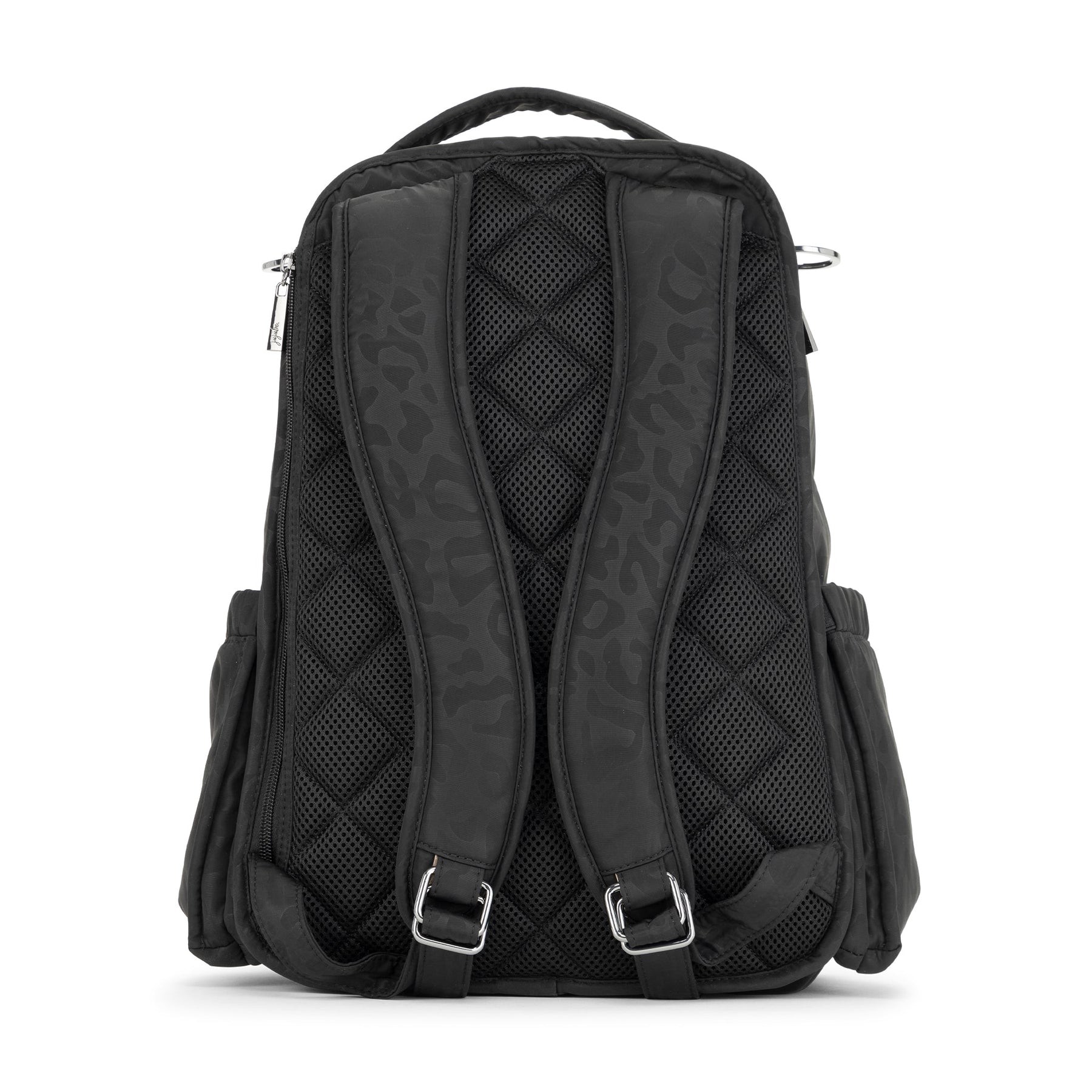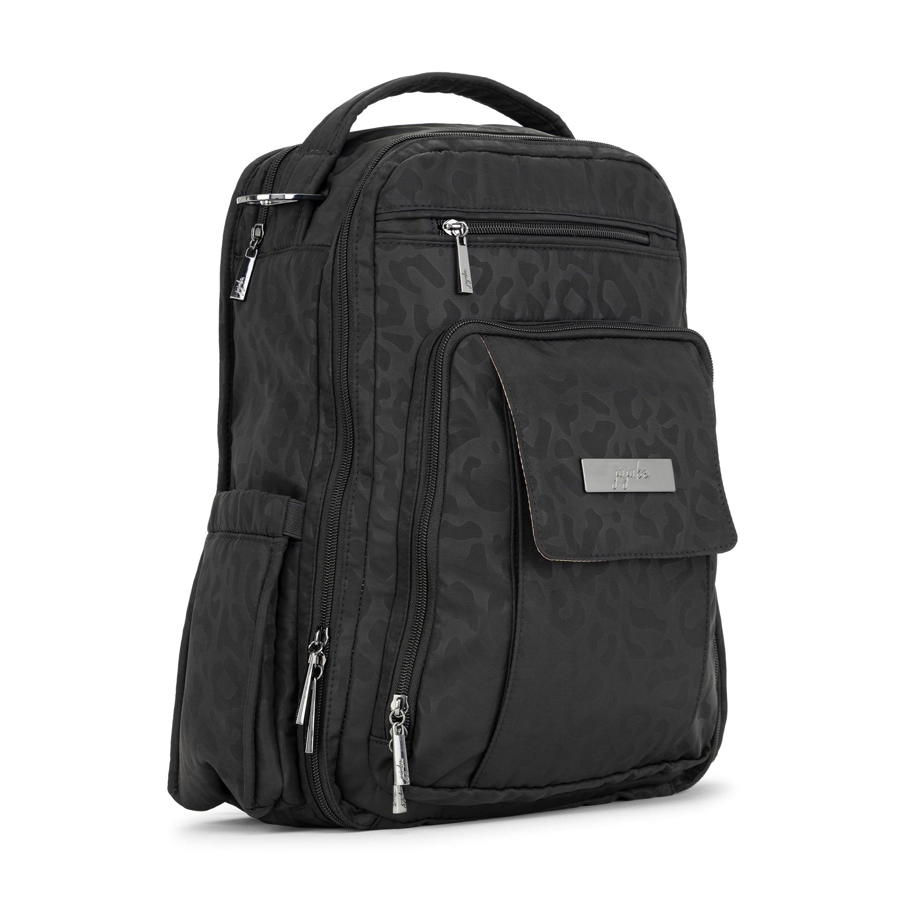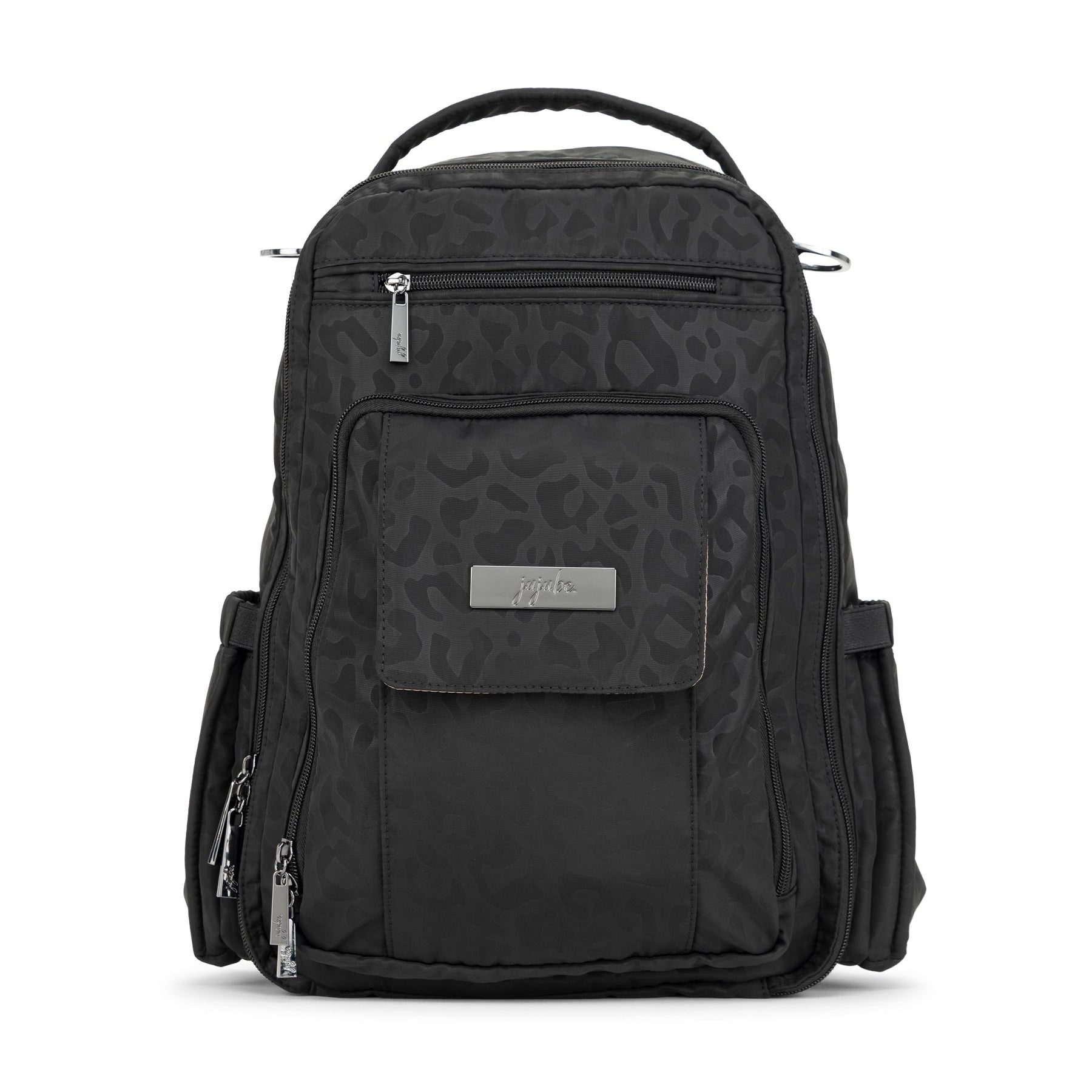 JuJuBe Be Right Back backpack in Black Catwalk print featuring sleek black design, gold hardware, and ergonomic straps for stylish hands-free parenting