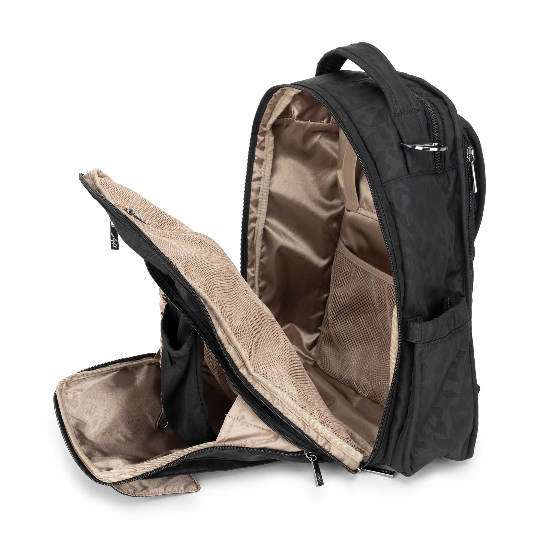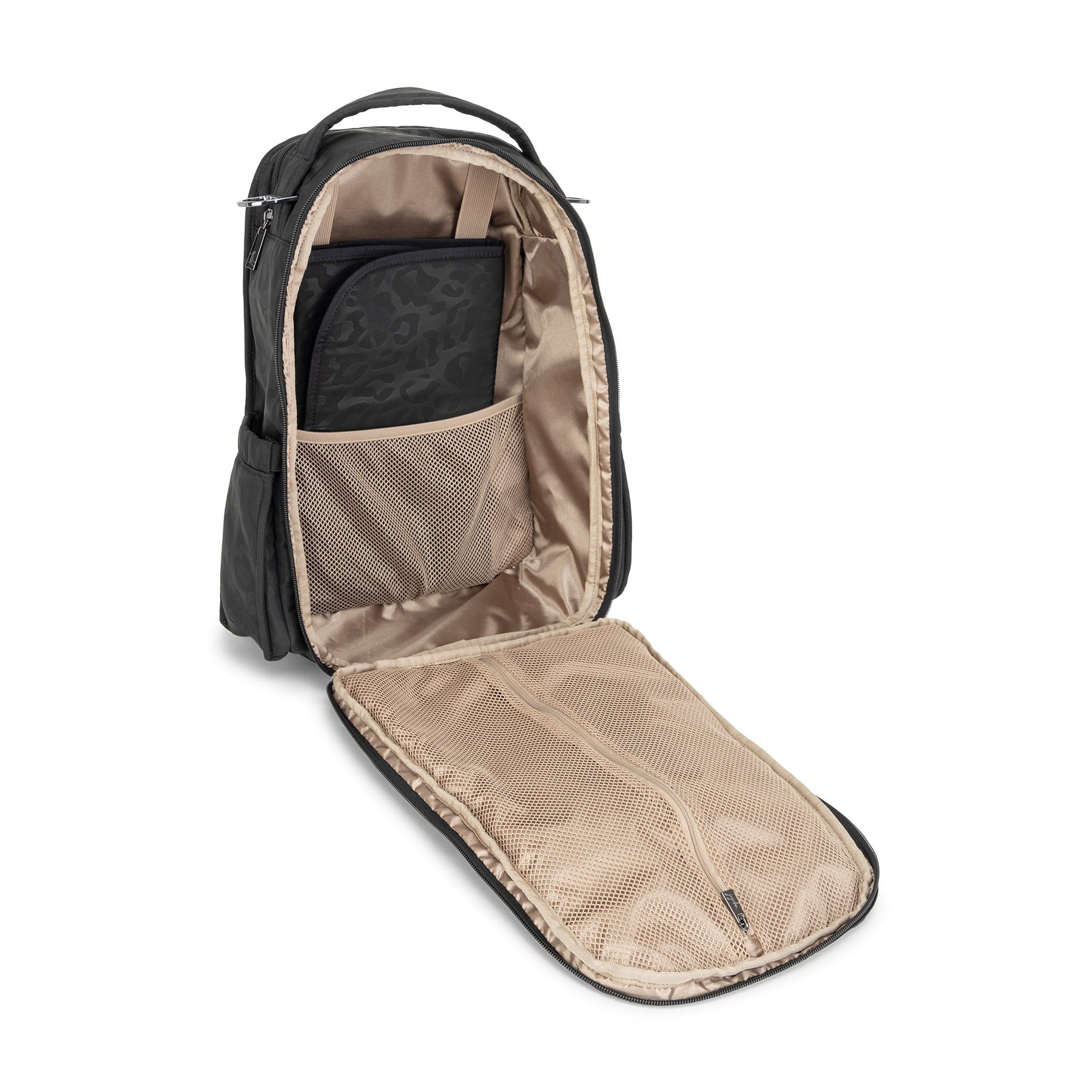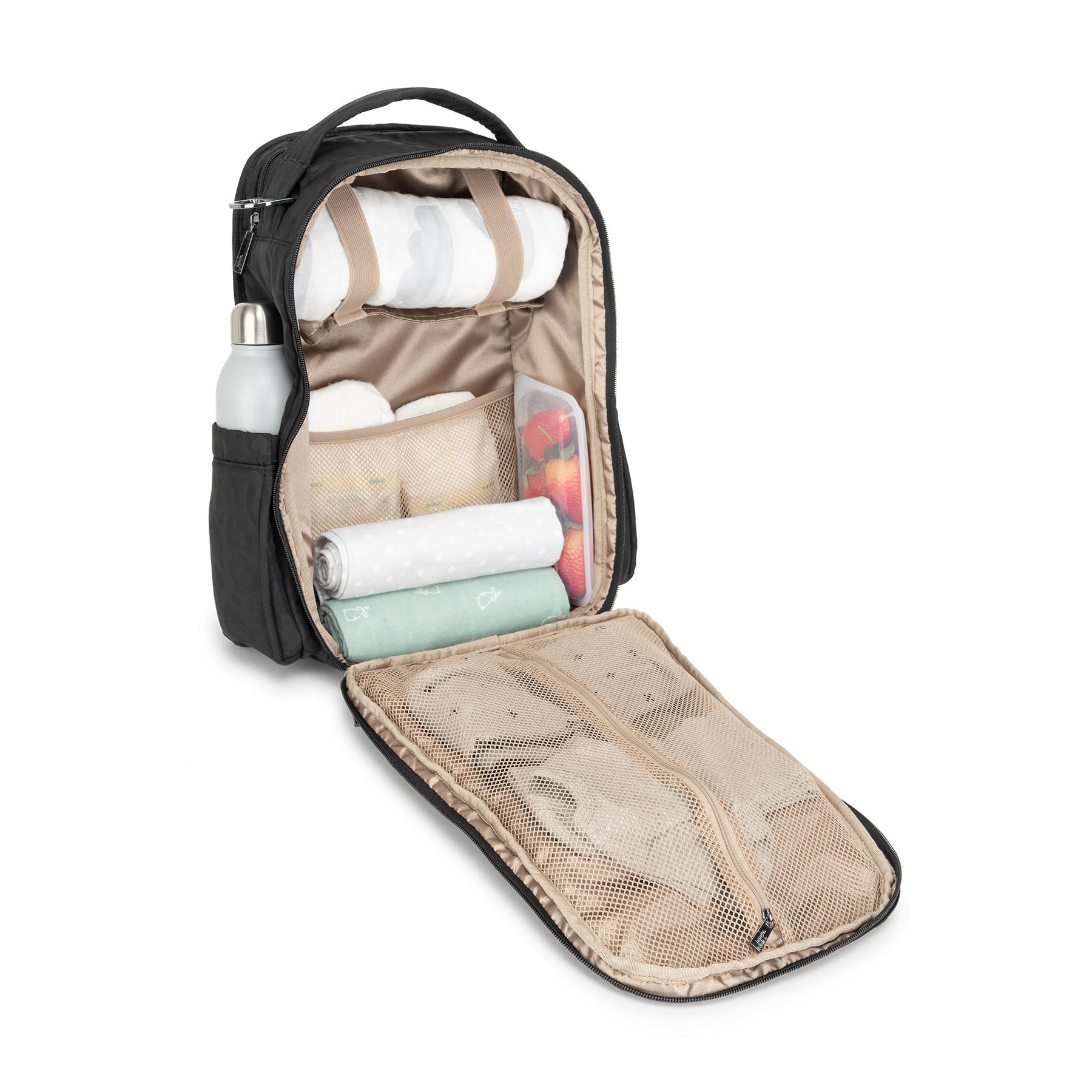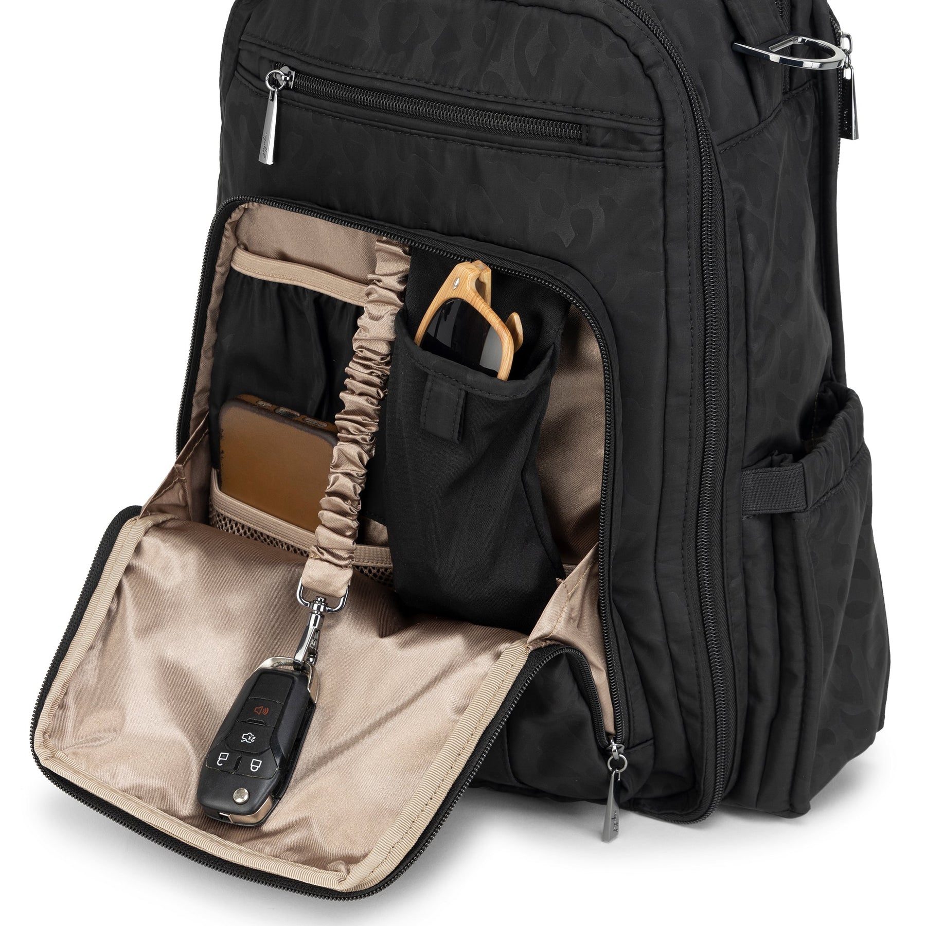JuJuBe Be Right Back backpack in Black Catwalk print featuring sleek black design, gold hardware, and ergonomic straps for stylish hands-free parenting