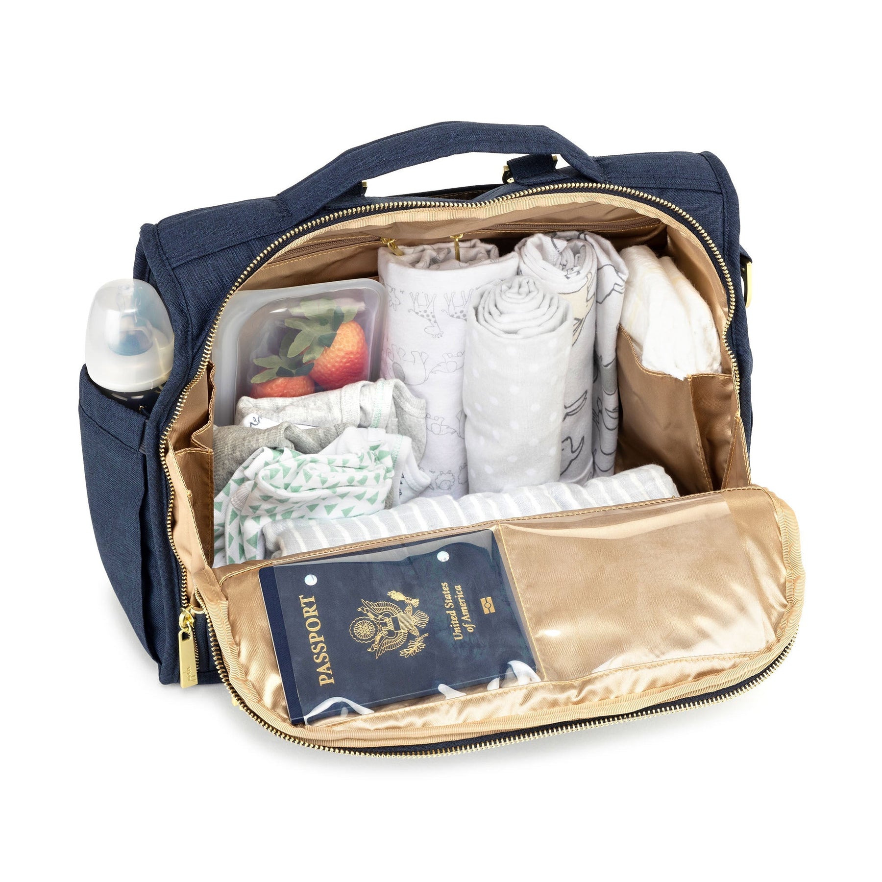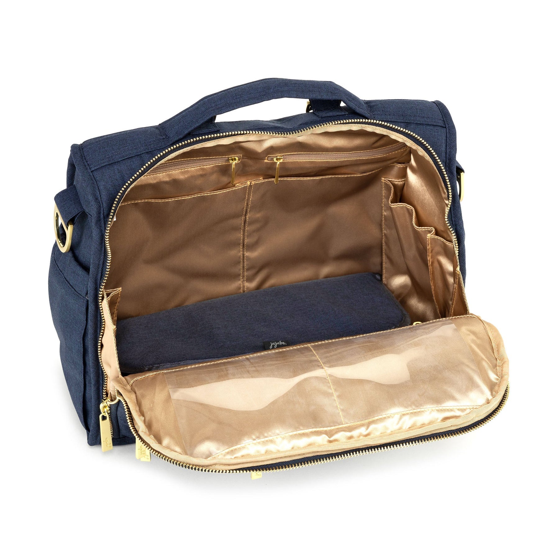 Jujube B.F.F. diaper bag in Indigo Chromatics color, featuring a sleek convertible design with multiple compartments and modern styling for parents on the go.