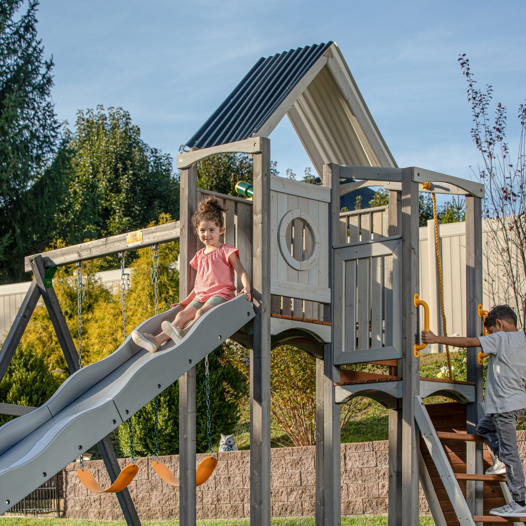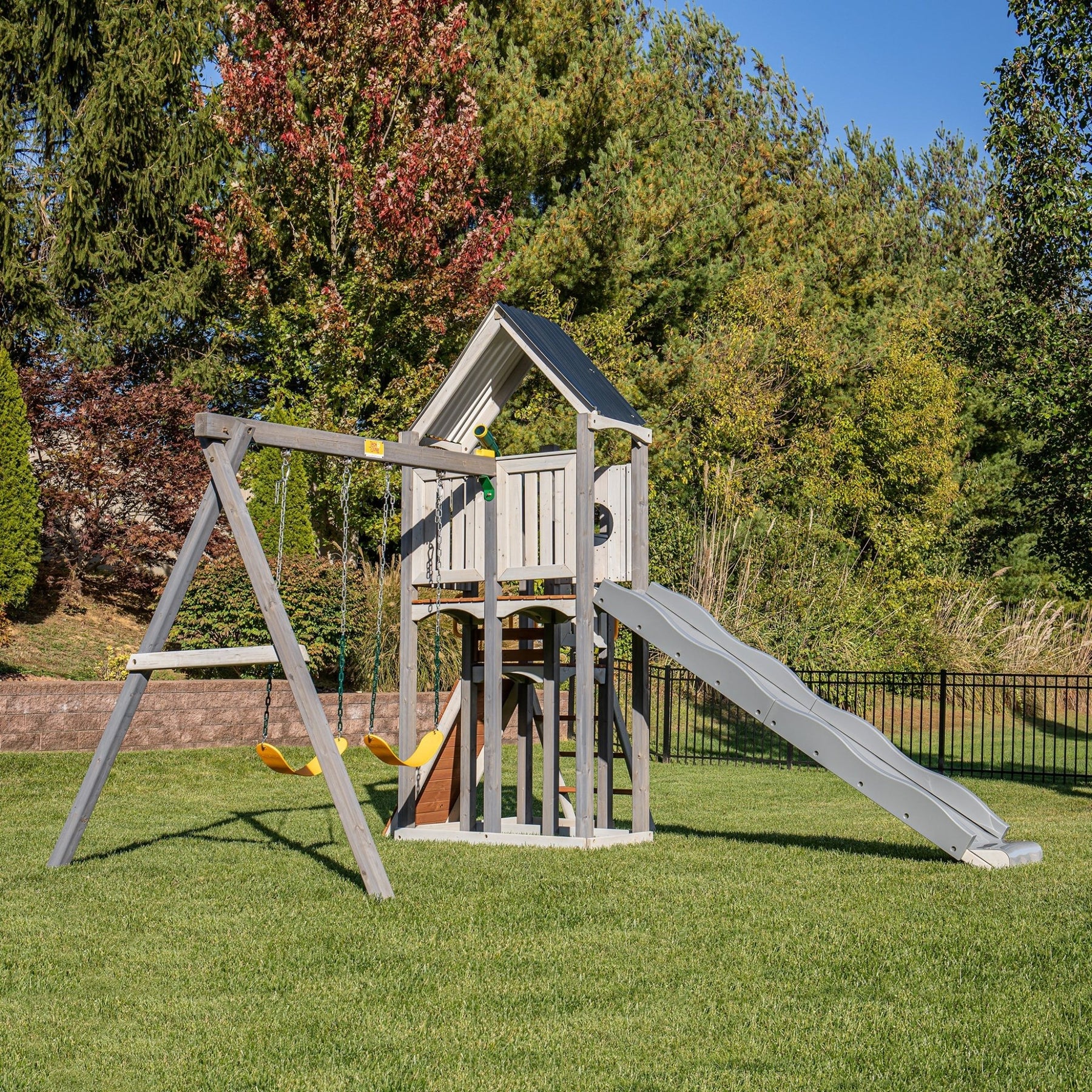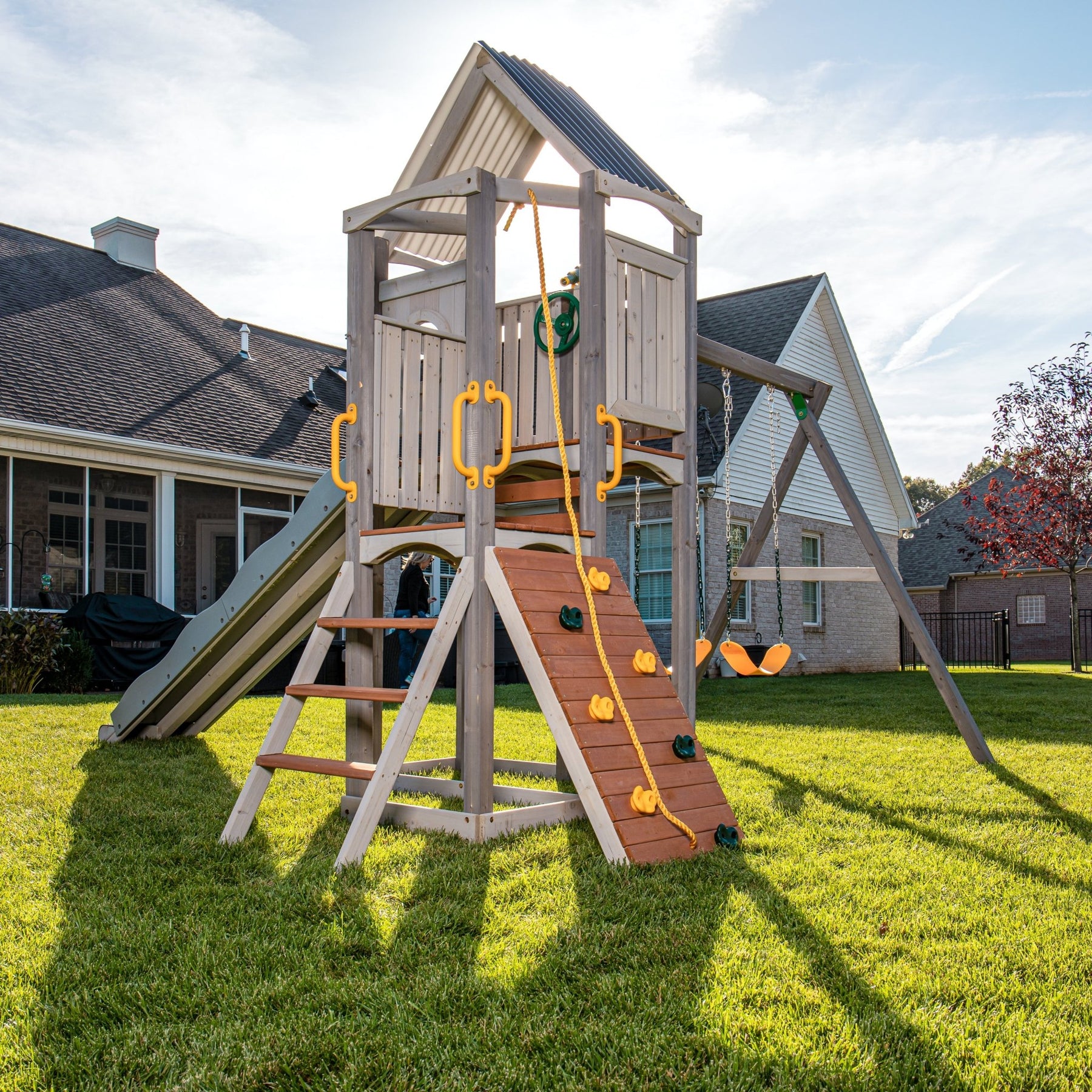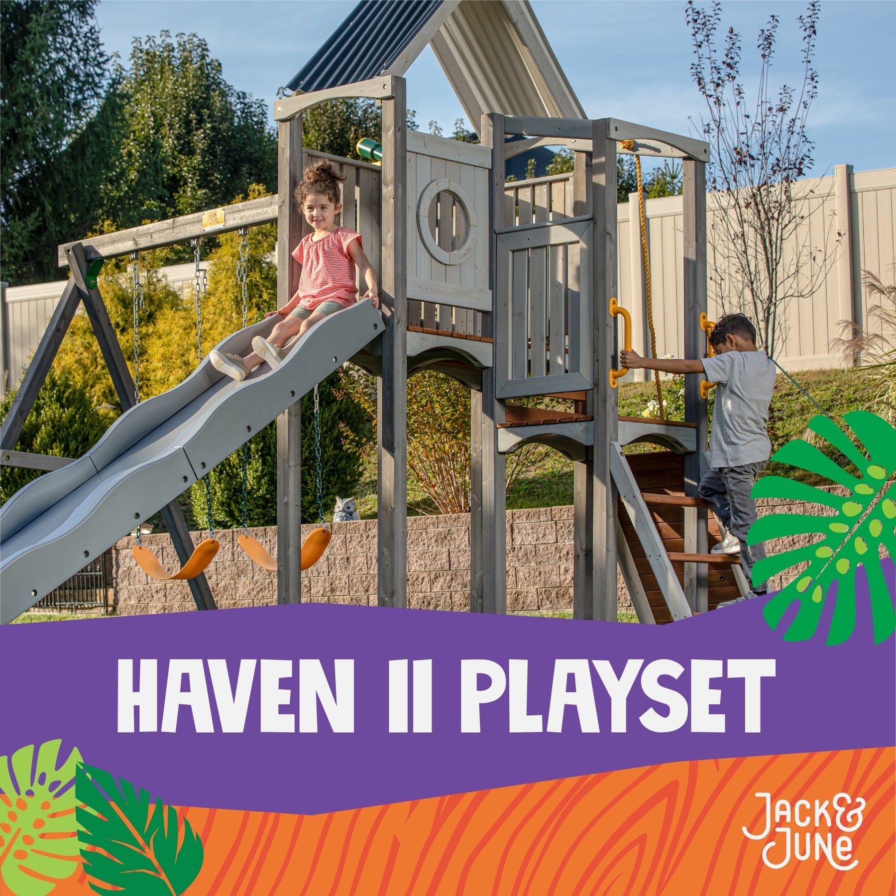 Jack & June Haven II wooden swing set with slide, rock wall, and two belt swings for backyard outdoor play