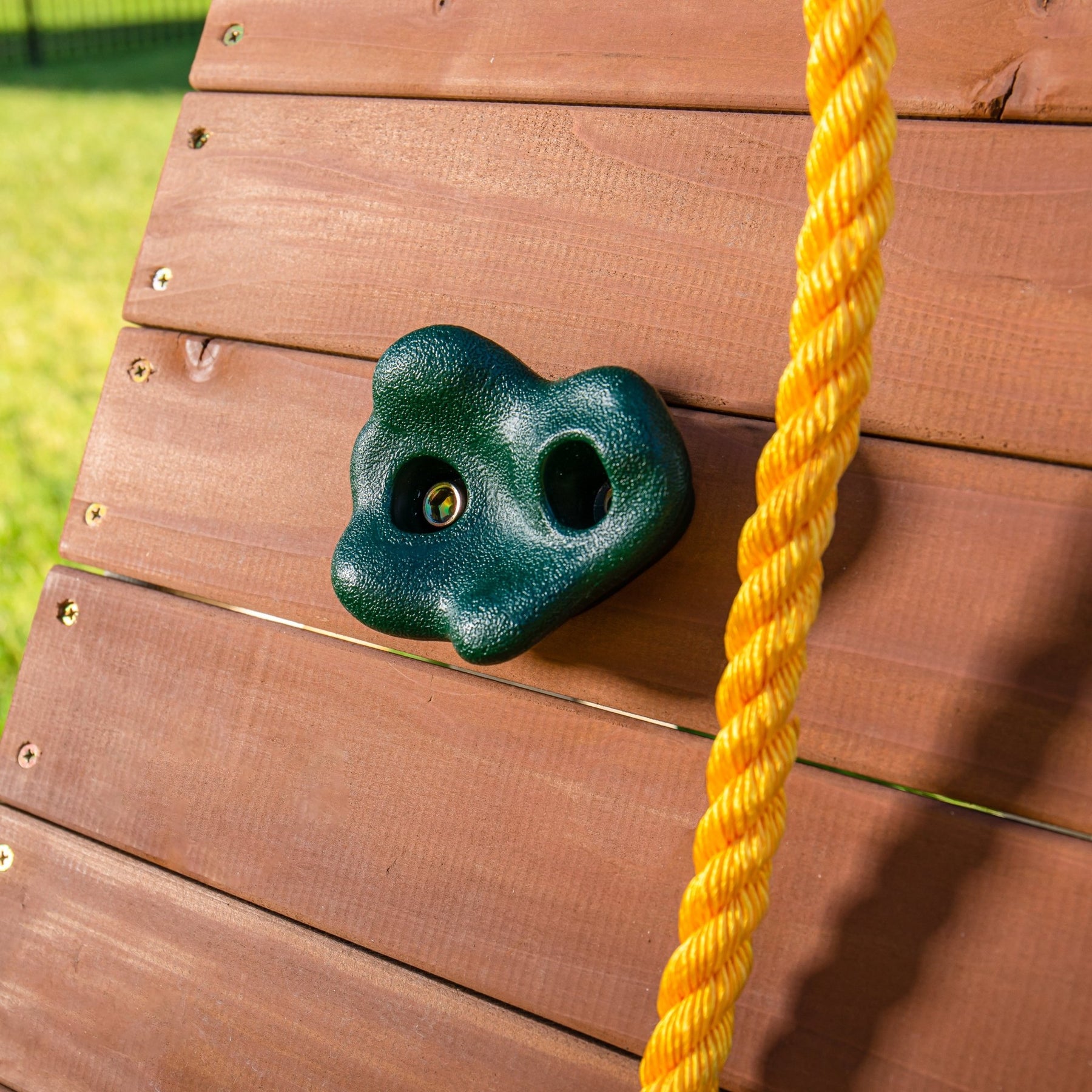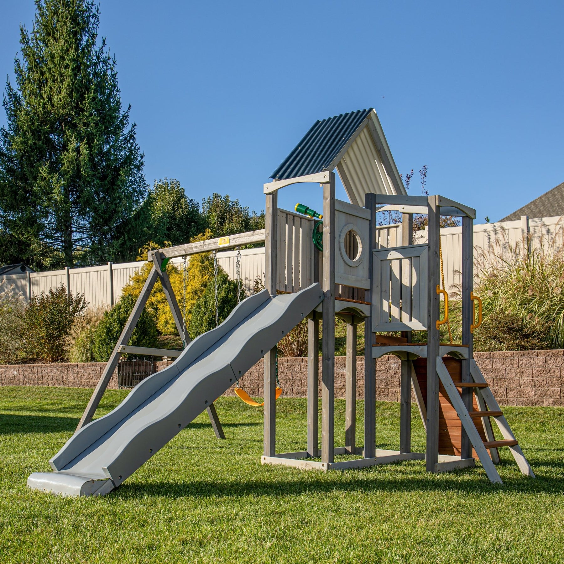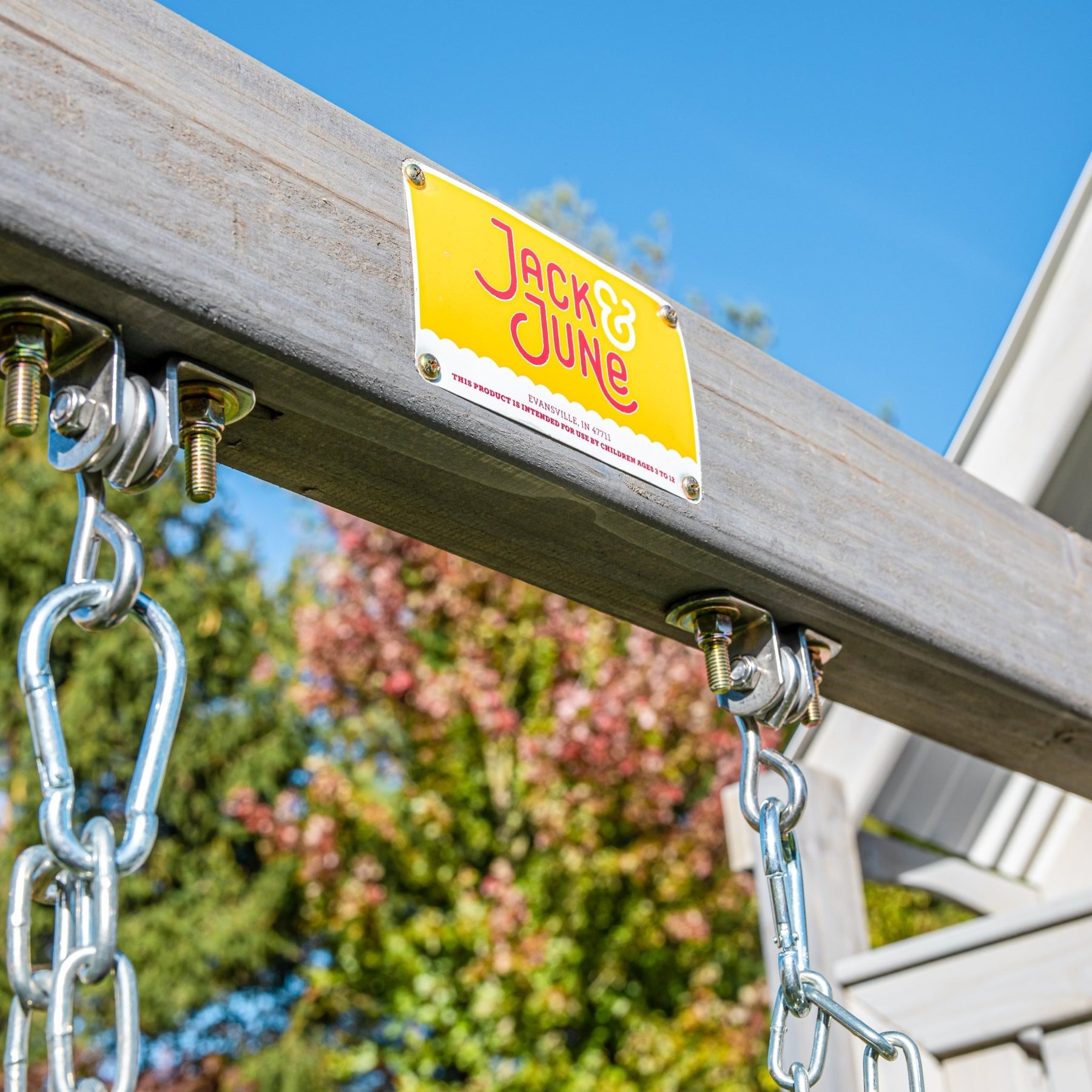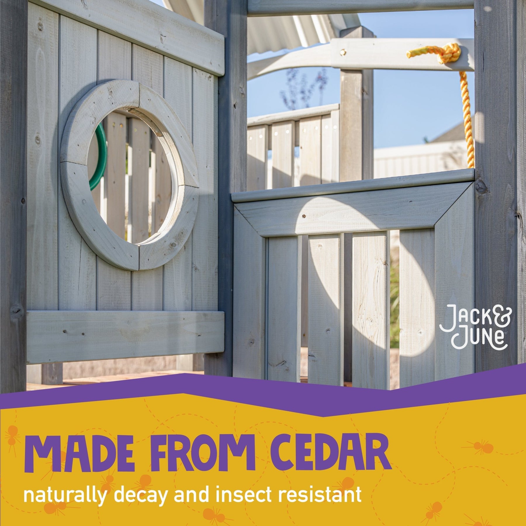 Jack & June Haven II wooden swing set with slide, rock wall, and two belt swings for backyard outdoor play