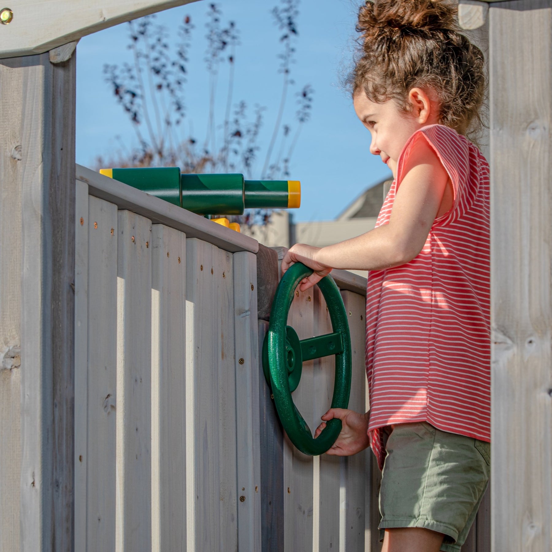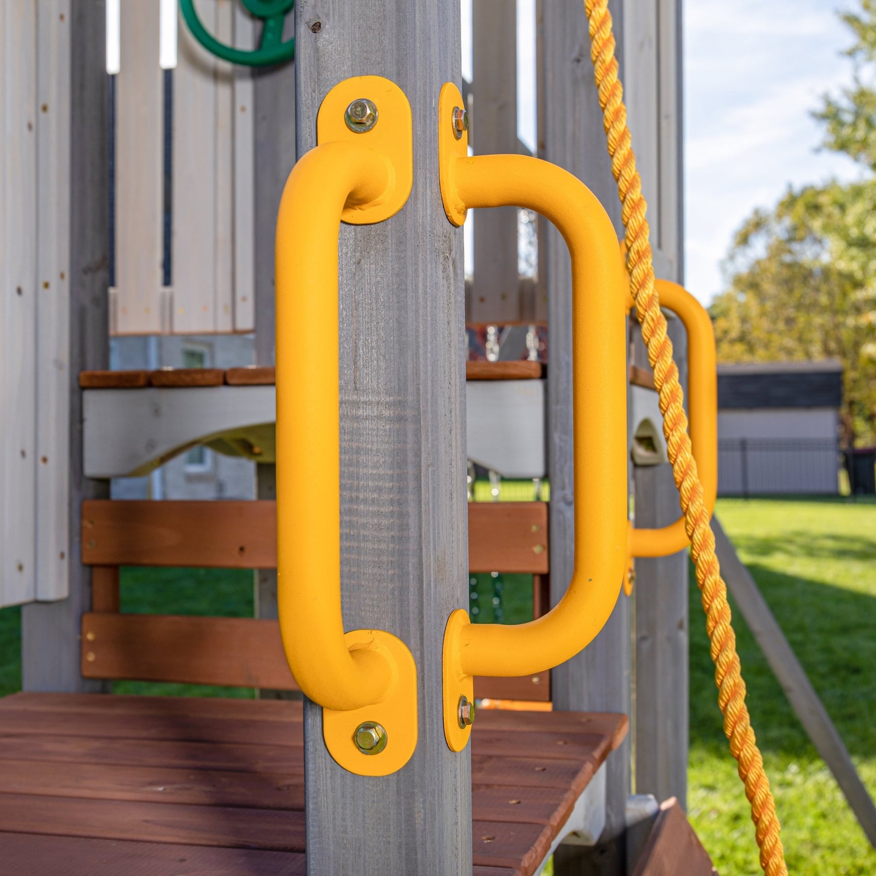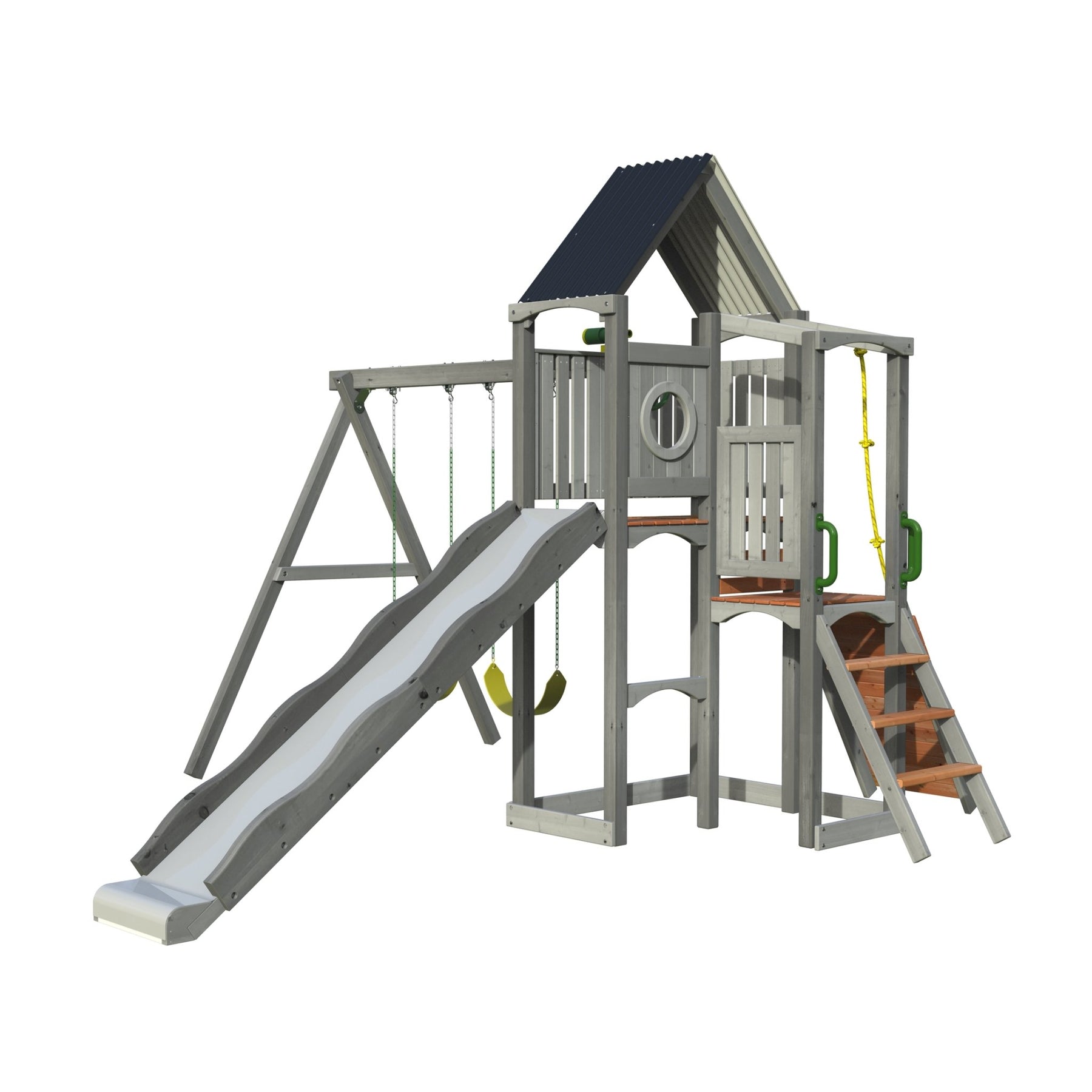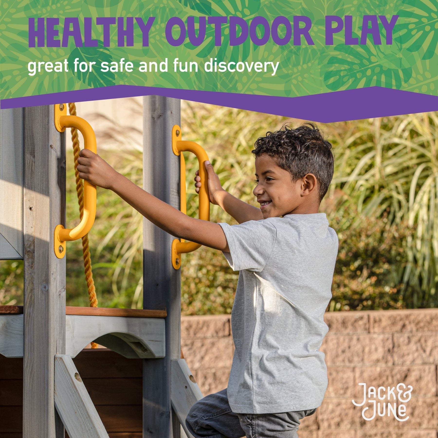 Jack & June Haven II wooden swing set with slide, rock wall, and two belt swings for backyard outdoor play