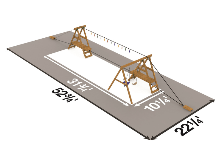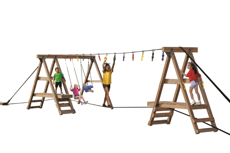 Children playing on a wooden swing set with ladders and colorful flags