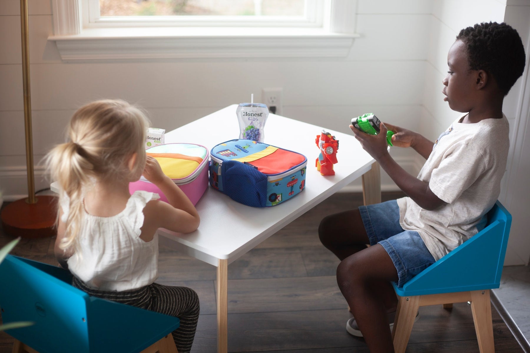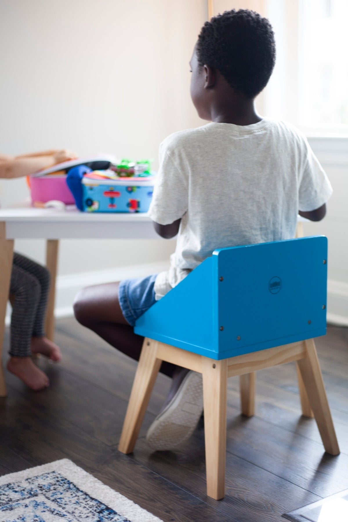 Daycare Modern Table & Chair Set - White Table Natural Legs w/ Blue Chairs